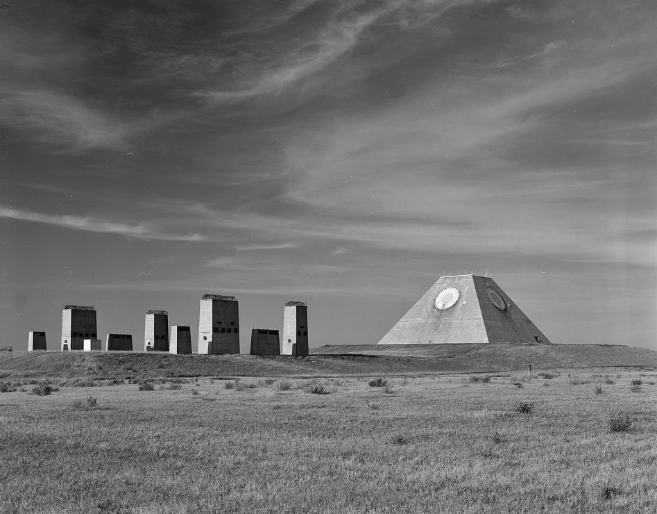 Benjamin Halpern: East oblique of missile site control building, with better view of exhaust (the taller columns) and intake shafts – Stanley R. Mickelsen Safeguard Complex, Missile Site Control Building, Northeast of Tactical Road; southeast of Tactical Road South, Nekoma, Cavalier County, ND (1992) (source)