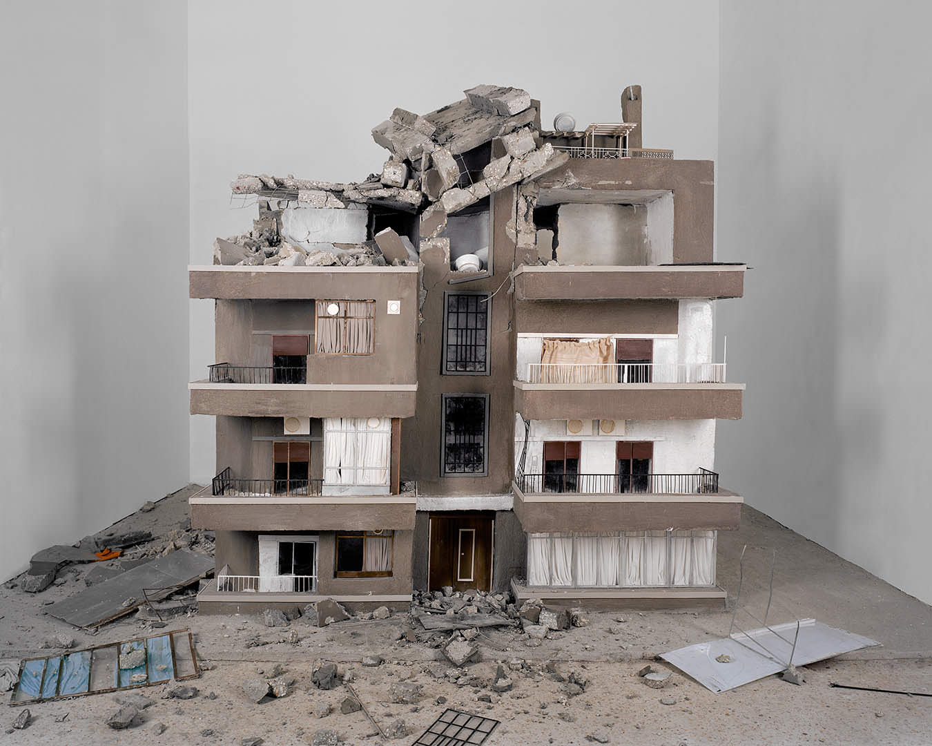 A still from Hrair Sarkissian’s video Homesick (2014), in which he destroys a scale model of the apartment building in Damascus in which he grew up and where his parents still live.