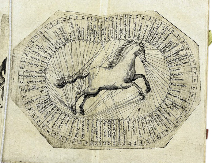 Illustration from Il cavallo da maneggio [The Arena Horse] by Giovanni Battista di Galiberto (1650), showing the anatomy of the horse and sites of common ailments and wounds. The full title of the work is Il cavallo da maneggio. : Libro. Dove si tratta della nobilissima virtv del cavalcare, come il cauagliere deue star’ à cauallo, acciò sia chiamato perfetto cauagliere, amato, e stimato da tutti; come si deue domar’ il cauallo, gouernare, inserrare, imbrigliare, amaestrare; in che tempo si deuono pigliar li poledri per ammaestrarli di tempo in tempo, e di scola in scola : della razza dei stalloni, de pelami; de segni d’infirmità che puol accader’ al cauallo : diviso in tre parti, nella prima sitratta del conoscer li caualli, nella seconda il modo di caualcare; nella terza il modo di medicar’ ogni sorte d’infirmità, con tre [tavole] [The Arena Horse. : Book. Wherein is set forth the most noble virtues of horseback riding, how the rider must sit on the horse so that he may be called a perfect horseman, loved and admired by all; How do you tame, govern, rein in, harness, and train the horse; How long the poles should be used to train them, and in what manner: of the breed of the stallions and their coats; of the signs of illness that may attack the horse: divided into three parts, in the first part of knowing the horses, in the second the way of riding; in the third the way to treat all kinds of infirmities, with three {tables}]. (source)