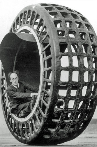 The Dynasphere was a monowheel vehicle patented in 1930 by J. A. Purves, who called it “the high-speed vehicle of the future”; one source, however, reports that “while the [vehicle] could move along just fine, it was almost impossible to steer or brake.” You can watch a video here. (source)
