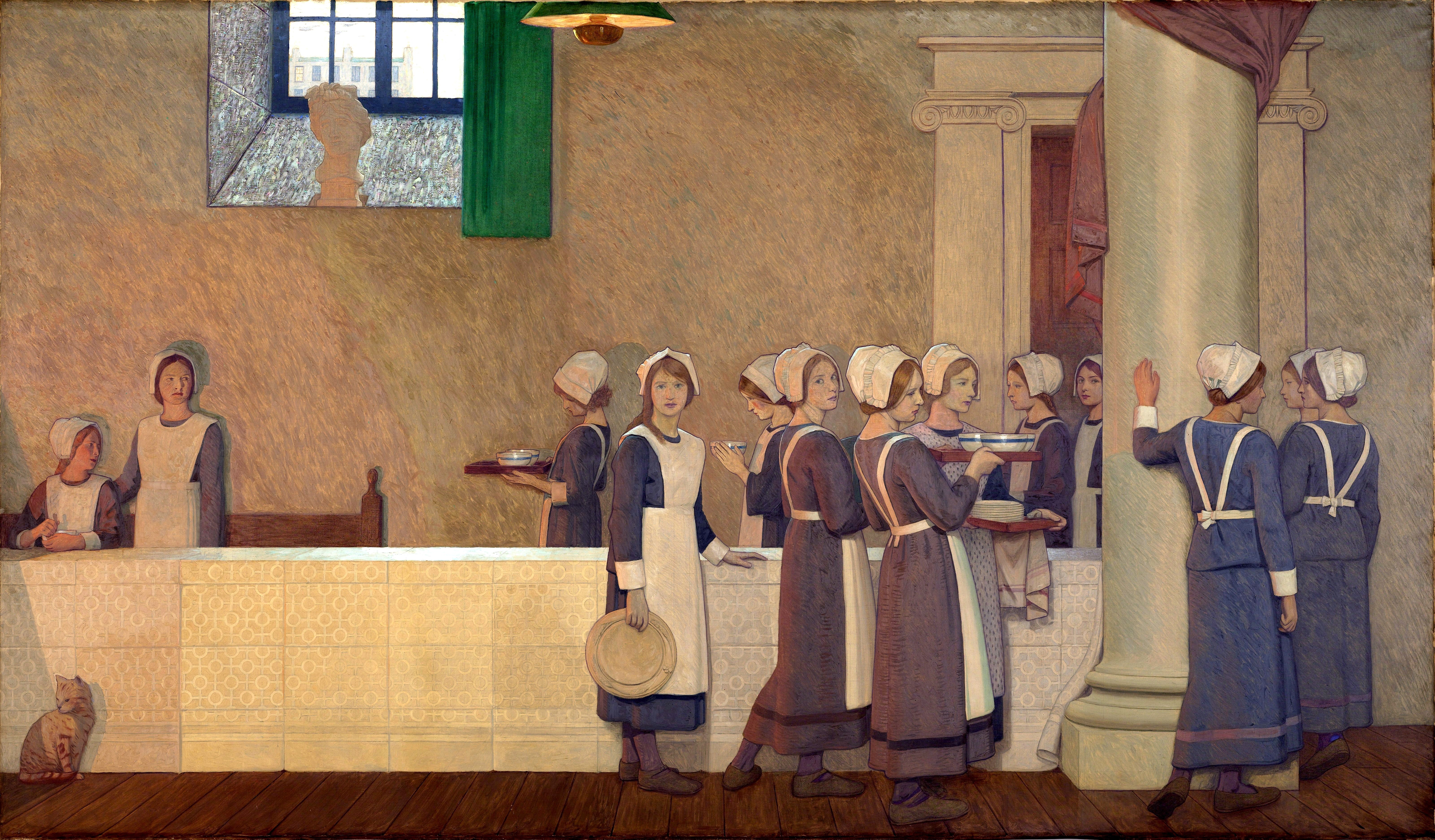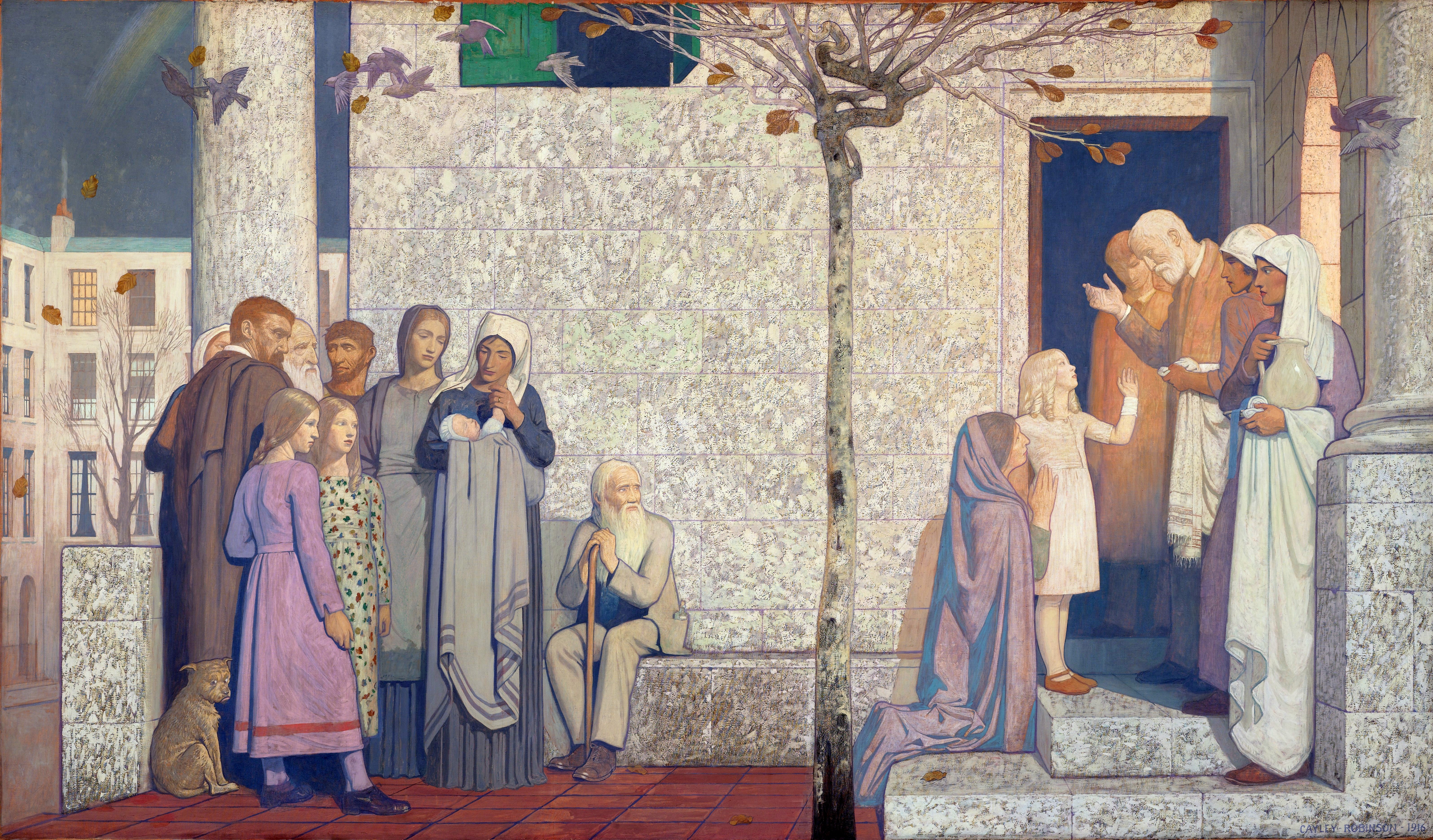 Frederick Cayley Robinson: Acts of Mercy (1916–20); it seems the first two paintings are referred to as The Orphans, while the second two are referred to as The Doctor.