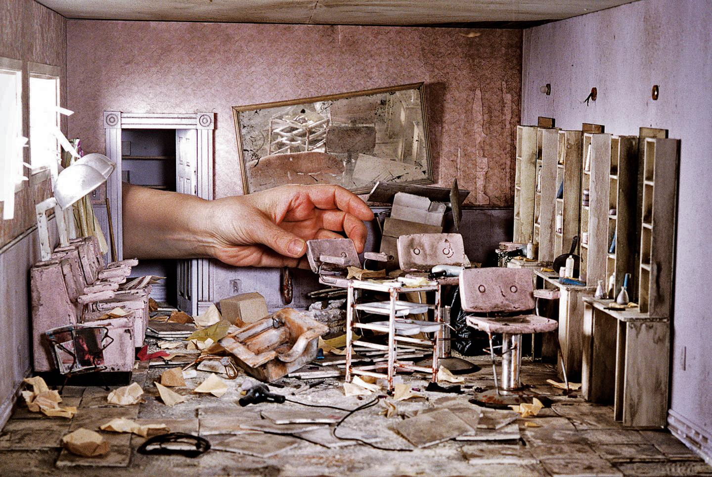 Lori Nix at work on Beauty Shop (2010), one of a series of photographs of post-apocalyptic miniatures. (See her website.)