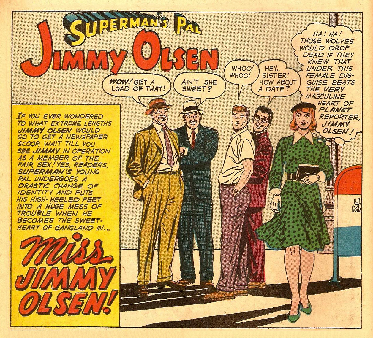 “A drastic change of identity”: Jimmy goes undercover as a woman in this story from Superman’s Pal, Jimmy Olsen Vol. 1, #44 (April, 1960); Curt Swan, penciler. See Transgender Identity and Superman’s Pal.