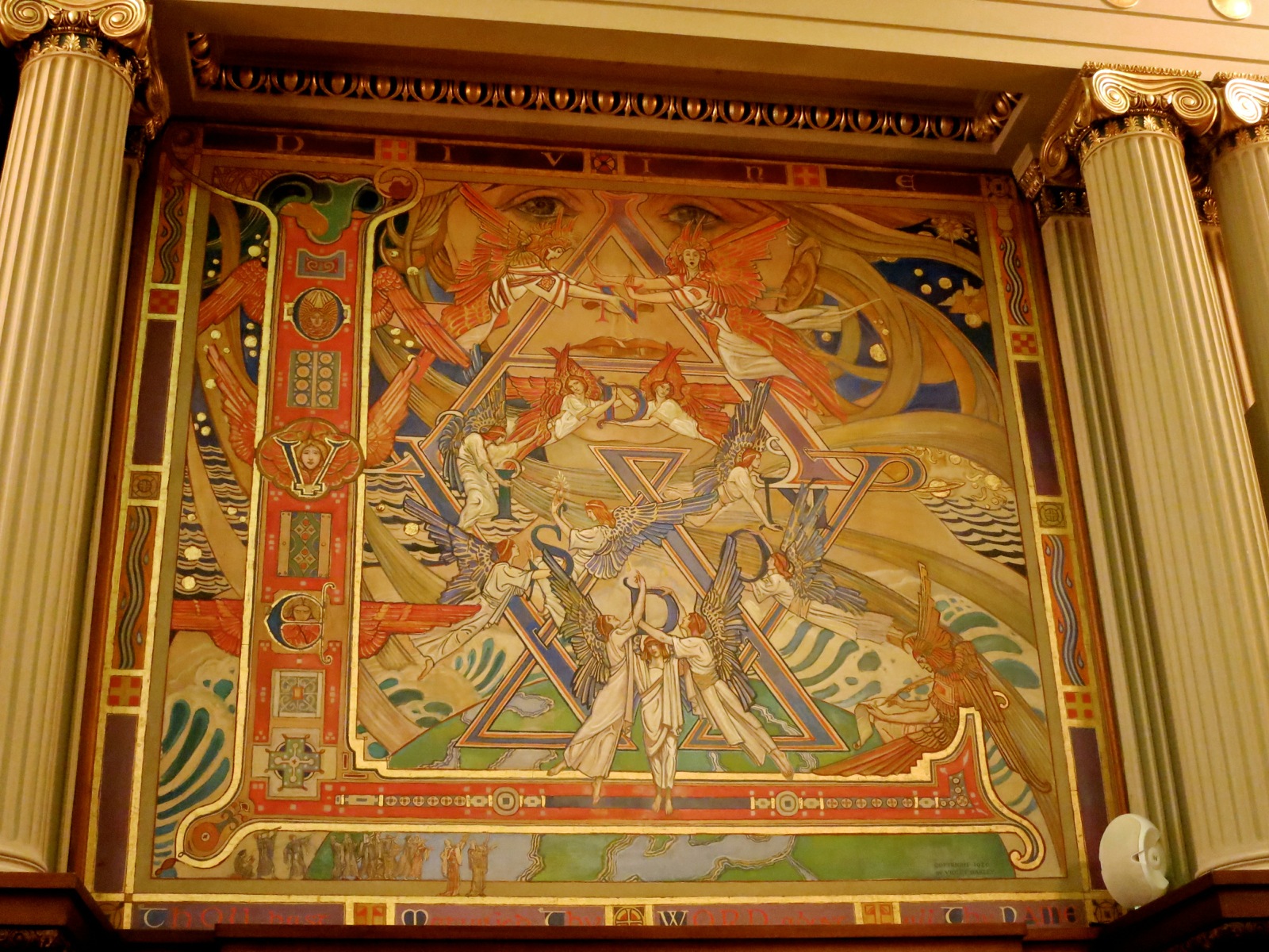 Beginning in 1902, Violet Oakley spent twenty-five years painting the murals that adorn the Pennsylvania state capitol building in Harrisburg. The image above is a study for her “Divine Law” mural in the Supreme Court, part of a series illustrating the evolution of law throughout history. The face of truth gazes into the room, the earth below surrounded by stars and planets. The words “DIVINE,” “LAW,” “LOVE,” and “WISDOM” are incorporated into the design. The murals were installed on May 23, 1927. (Sources here, here, and here)