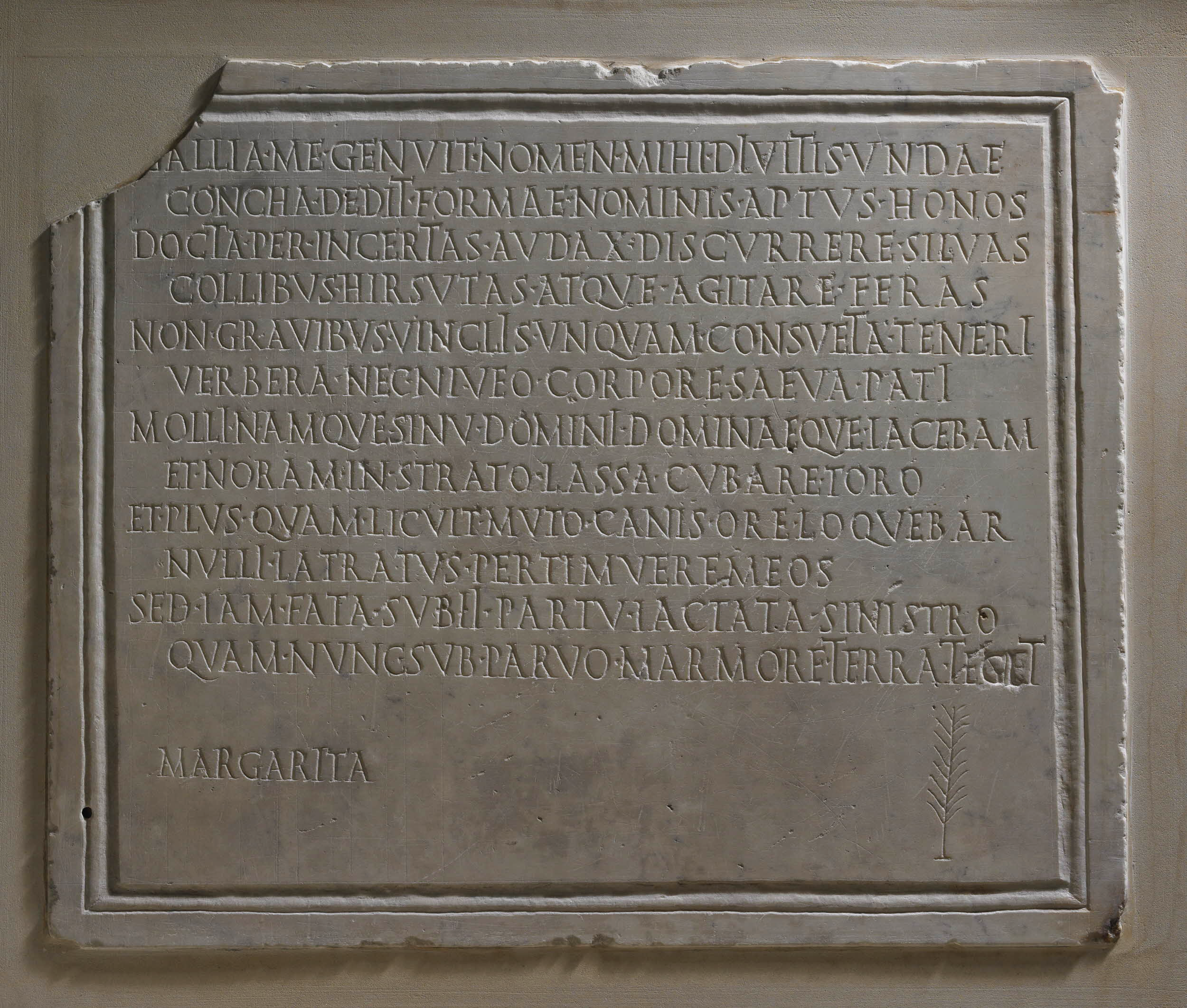 A 1st or 2nd century Roman epitaph for a pet dog named Margarita (“Pearl”), written from the point of view of the deceased: