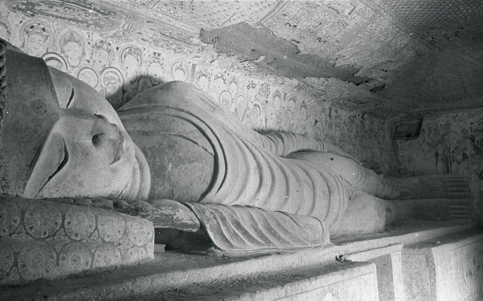 This photo was taken by James Lo in the 1940s; the sculpture represents the Buddha achieving parinirvana—the nirvana-after-death that occurs when a person dies after attaining nirvana during their life, ending the cycle of death and rebirth. It dates from the Middle Tang dynasty (781–848). See more here.