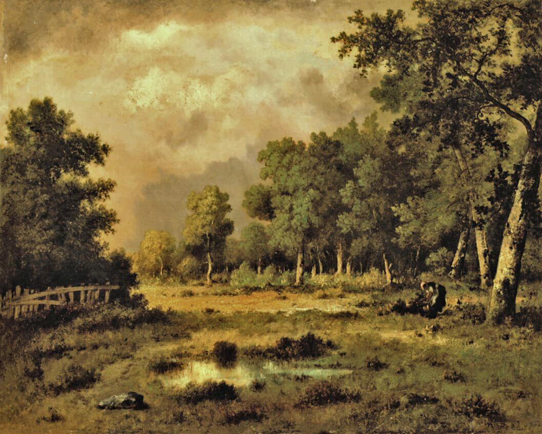The painting is Narcisse Diaz de la Peña’s The Forest Clearing (1875).