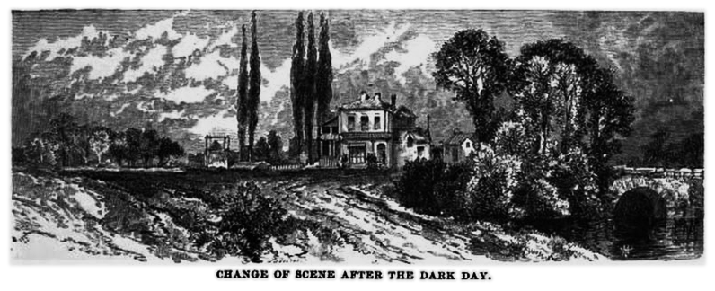 The darkness commenced between the hours of 10 and 11 A. M., and continued to the middle of the next night. It was occasioned by a thick vapour or cloud, tinged with a yellow color, or faint red, and a thin coat of dust was deposited on white substances.
