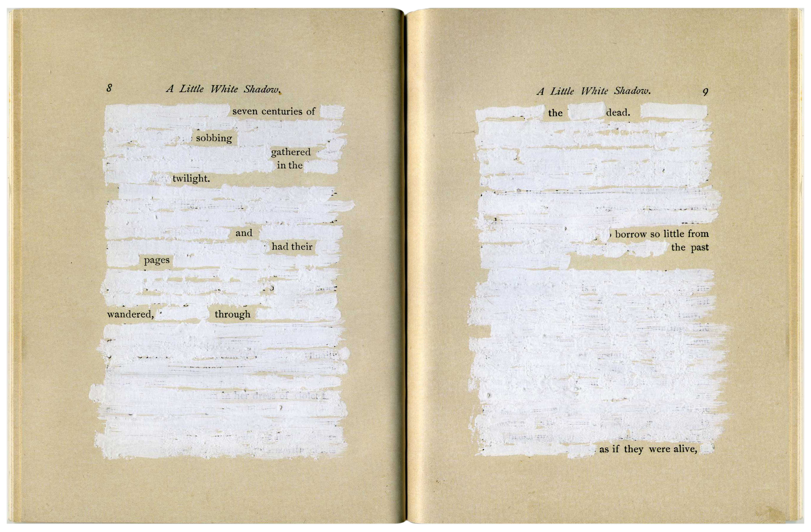 Pages from Mary Ruefle’s book A Little White Shadow, which was composed by whiting out text from Emily Malbone Morgan‘s 1890 book of the same name.