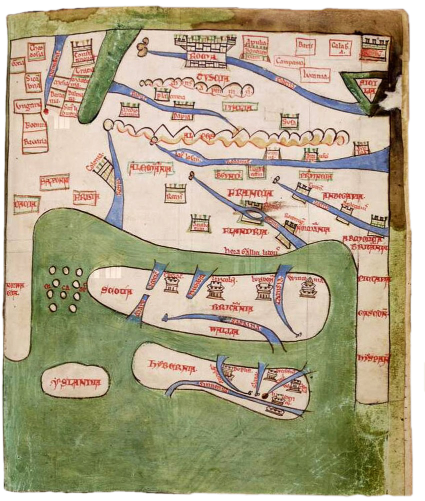 The map from the book shows Europe, Great Britain, Ireland (Hibernia), and Iceland; north is on the left.