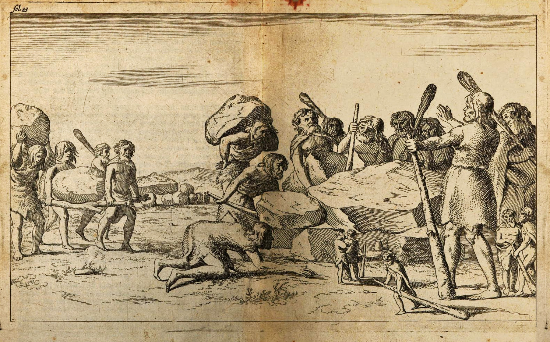 The 17th century Dutch minister Johan Picard spent several years in Drenthe, where he became interested in the ancient stone structures that could still be seen in the area. His research eventually led to the publication of his book A Short Description of Some Forgotten and Hidden Antiquities. One theory in the book, illustrated above, is that the megalithic Stonehenge-like structures had been built by giants as humans looked on.