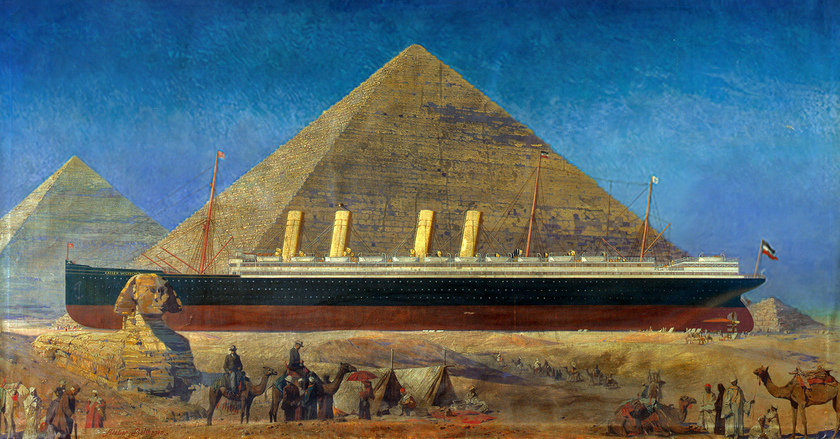 This publicity image of the SS Kaiser Wilhelm II in front of the Great Pyramids of Egypt was painted in the Otto Bollhagen studios around the time of the ship’s completion in 1903. During World War I, the ship was seized by the U.S. Government, renamed the USS Agamemnon, and put into service as a troop transport ship.