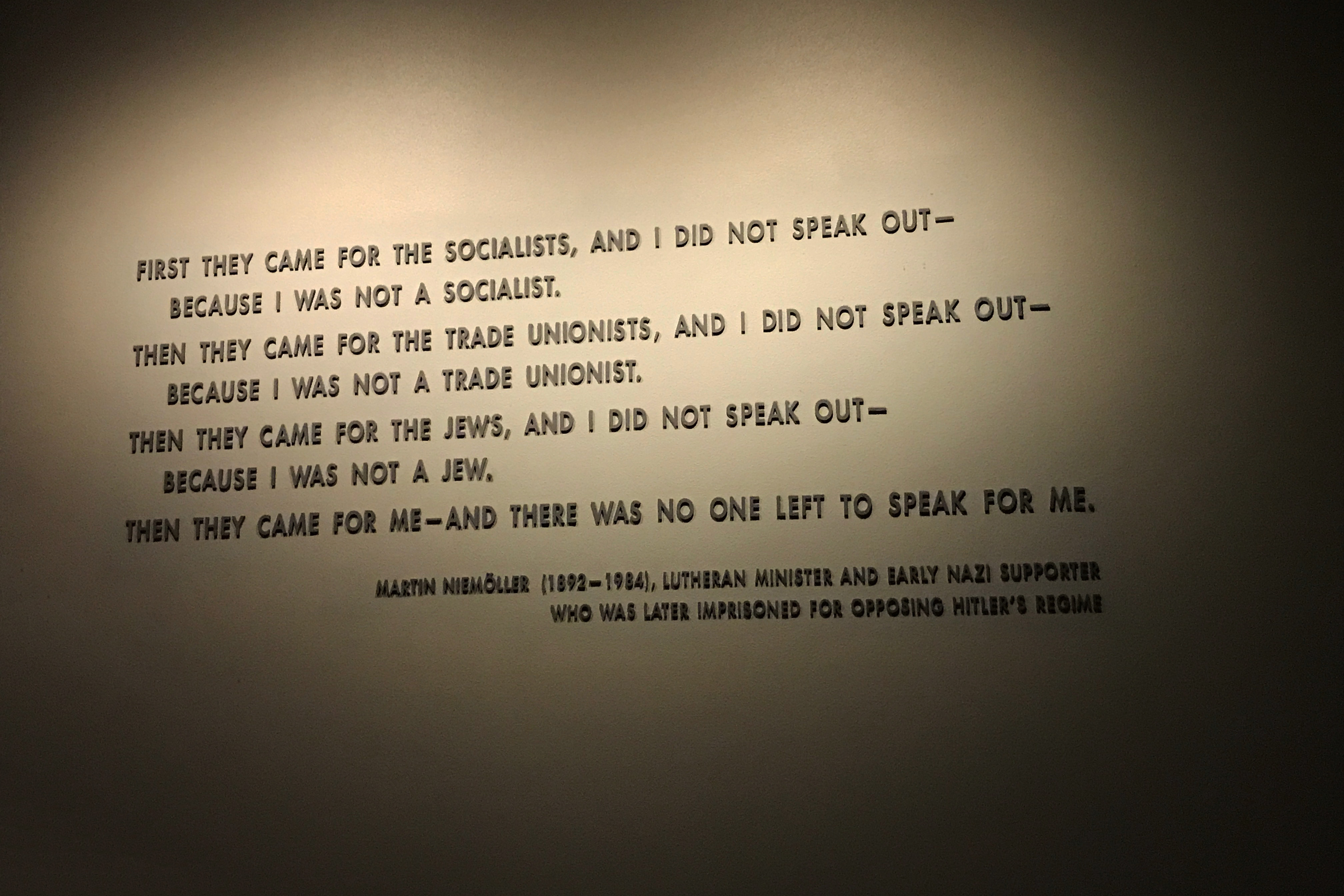 Sadly, this means that the version in the United States Holocaust Memorial Museum, with its omission of “Communists” (above), is unfaithful—not only to the existing historical record but to the challenging spirit of the poem itself.