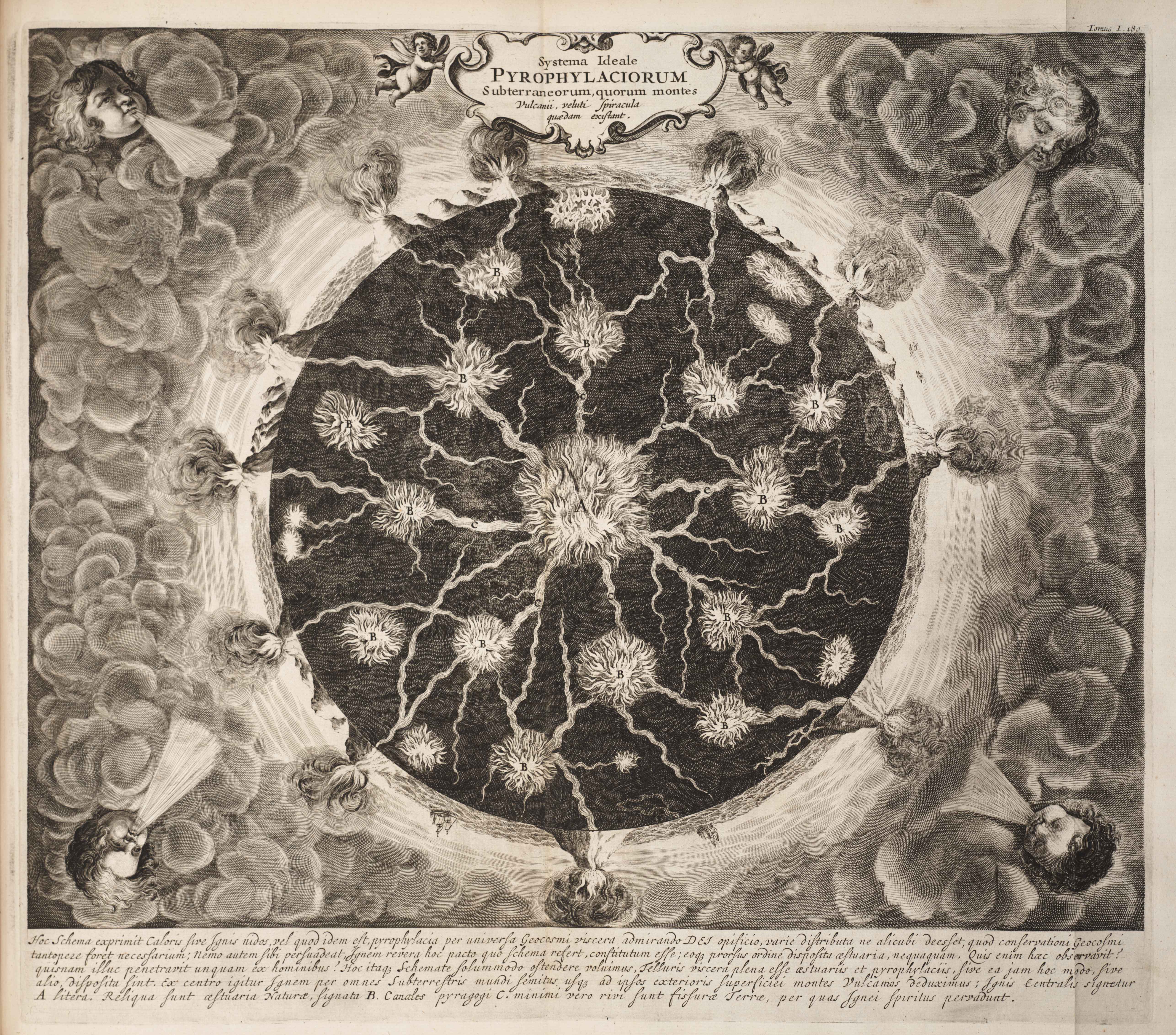 Systema Ideale Pyrophylaciorum Suberraneorum, quorum montes Vulcanii, veluti spiracula quaedam existant, an illustration from Athanasius Kircher’s 1665 Mundus Subterranous.