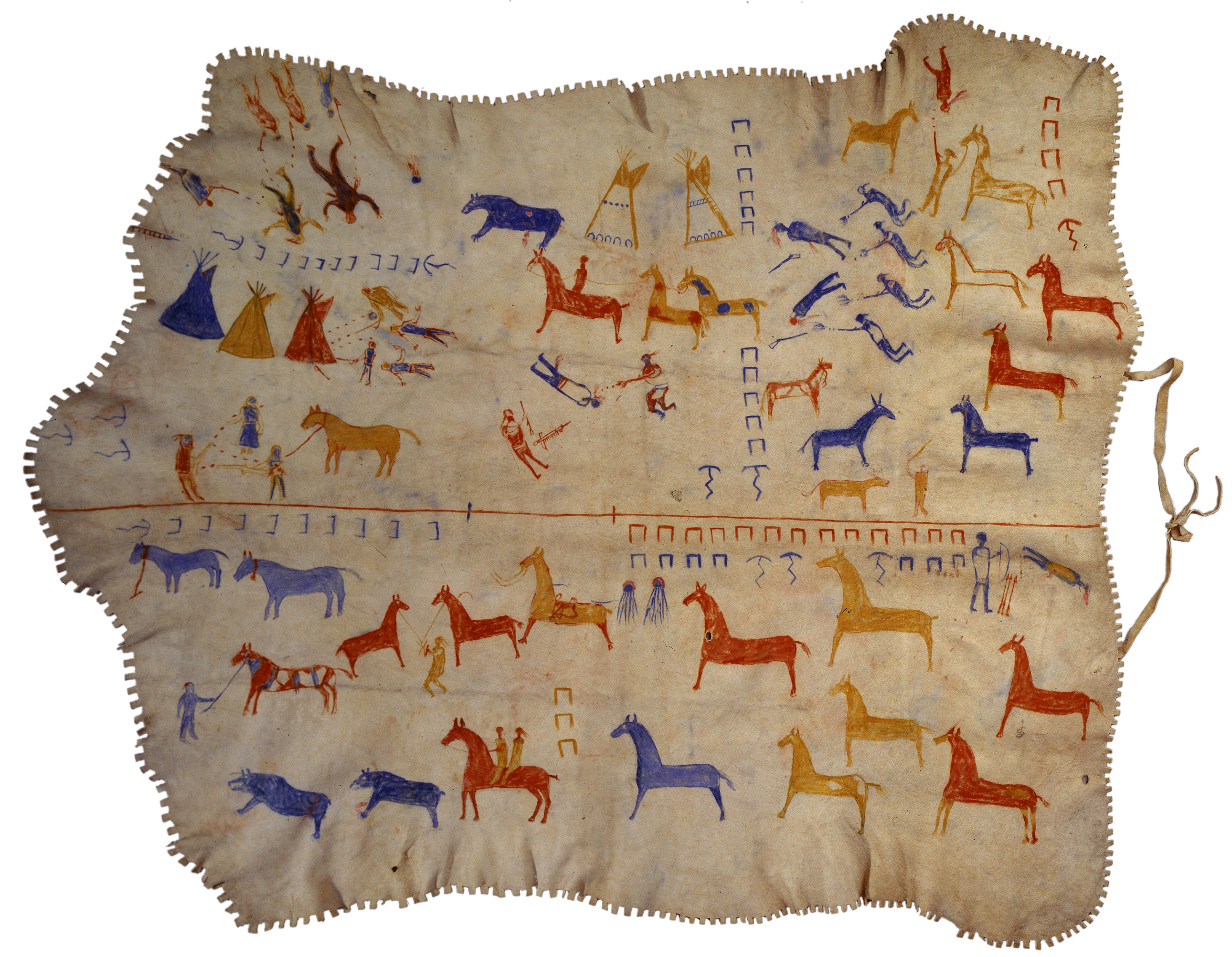 James White Calf (attrib): Elkskin Robe (ca. 1920); the robe is a record of the war honors of Mountain Chief, a Blackfeet chief.