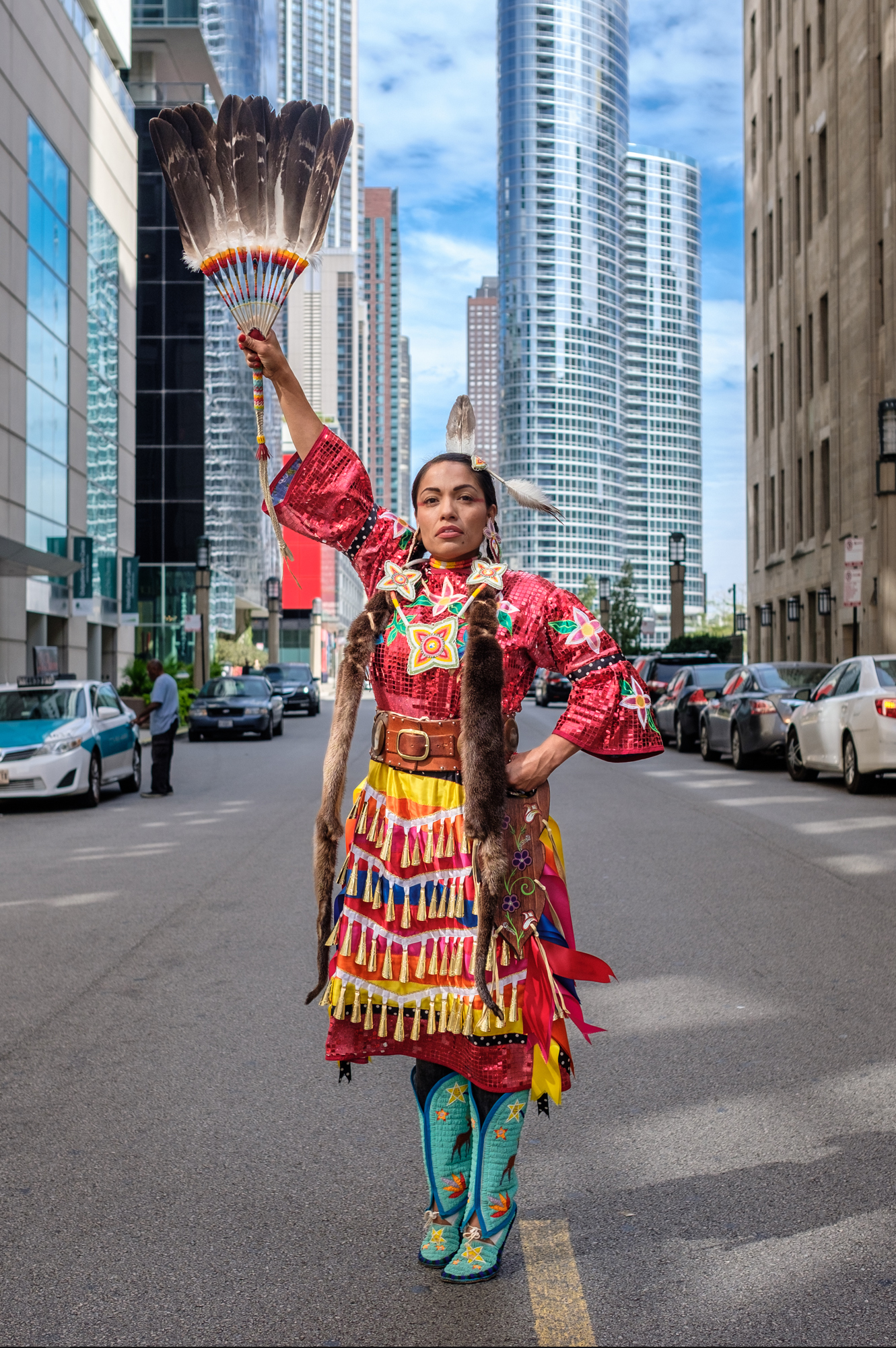I am currently working on a broader project making a series of portraits of Native Women wearing traditional regalia in metropolitan settings, in order to illustrate that wherever a person goes, they’re on Native land. In order to illustrate that point, I am working to photograph Women who are descended from tribes that originally occupied the land each featured city was built on.