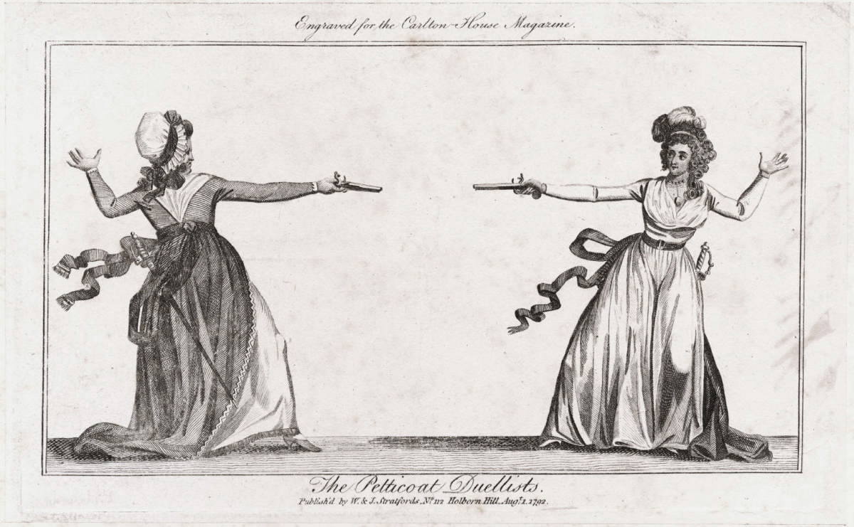 The two met at Hyde Park and drew pistols. Mrs Elphinstone shot a hole through Lady Almeria’s hat, knocking it to the ground. When swords were drawn, Lady Almeria wounded the arm of her opponent, who then agreed to compose a letter of apology. (source)