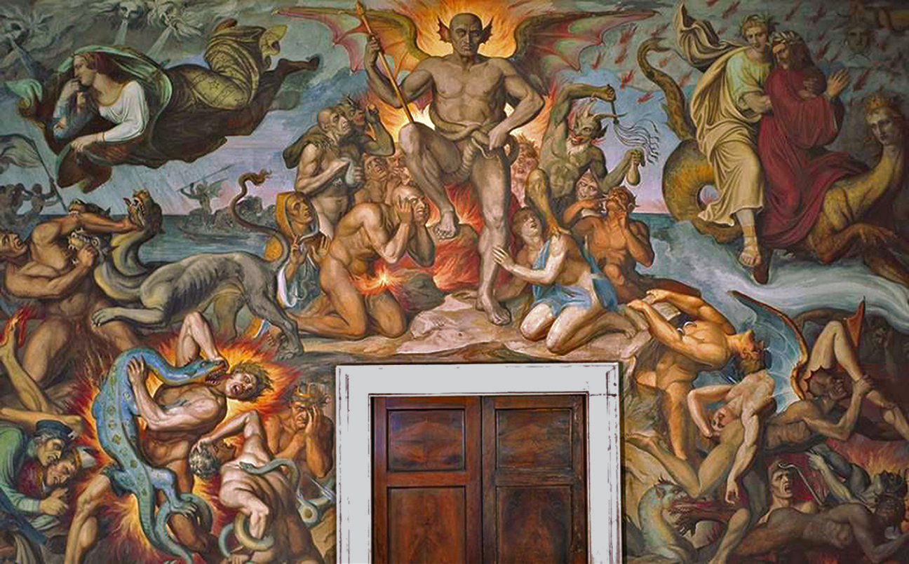Joseph Anton Koch’s frescos of Dante’s Inferno (1825-28) decorate the Sala Dante in the Casino Massimo, a Roman Villa. Several scenes from the poem are illustrated here, including Dante and Virgil’s ride on the monster Geryon (upper right) and Count Ugolino gnawing on the head of Archbishop Ruggieri (bottom left).
