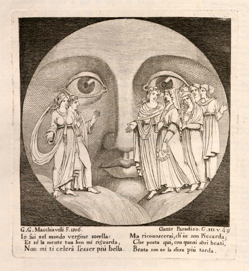 Creator: Macchiavelli, Gian Giacomo (Italian printmaker, 1756-1811); Macchiavelli, Gian Giacomo; Date: 1821; Measurements: 14.52 x 13.31 cm; Repository: Division of Rare and Manuscript Collections, Cornell University Library: Fiske Dante Collection; Publication Place: Bologna; Printer/Publisher: Gamberini e Parmeggiani; Classification: Prints; Canticle: Paradiso; Canto: 3; Canticle Image: 3; Canto Image: 1; Volume Image: 72; Caption: G.G. Macchiavelli. F. 1806. Io fui nel mondo vergine sorella : / Et sè la mente tua ben mi riguarda, / Non mi ti celerà l’esser più bella. / Ma riconoscerai, ch’ io son Piccarda;/ Che posta qui, con questi altri beati, / Beata son ne la sfera più tarda. Dante Paradiso. C. III. v. 49; Call Number: PQ4302.E19d+; Voyager ID: 1354972; Provenance: Biblioteca Dantesca collected by Willard Fiske 1893-1894.